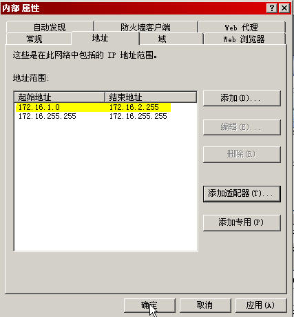 在弹出的内部属性对话框,点击地址,删除过去的172.16.2.0/24,点击添加适配器,