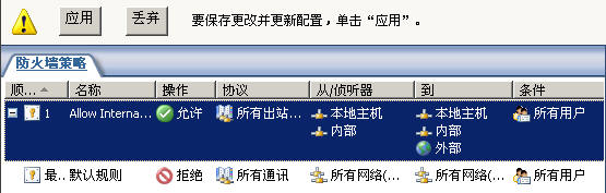 添加访问规则是ISA Server最基本的操作,在此我就不多重复了。如下图,我建立好了一条允许本地主机、内部访问本地主机、内部和外部网络的所有协议的访问规则。点击应用以保存修改和更新防火墙策略;