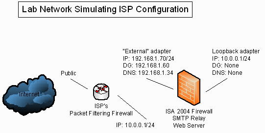 这篇文章中我们将讨论ISP托管配置,下图是实验部署图,你可以使用VMware或者Virtual PC虚拟网络环境测试实验。你可以从位于ISA 2004防火墙物理接口同一网段的主机测试,也可以从位于Internet路由器一端的广域网主机上测试。