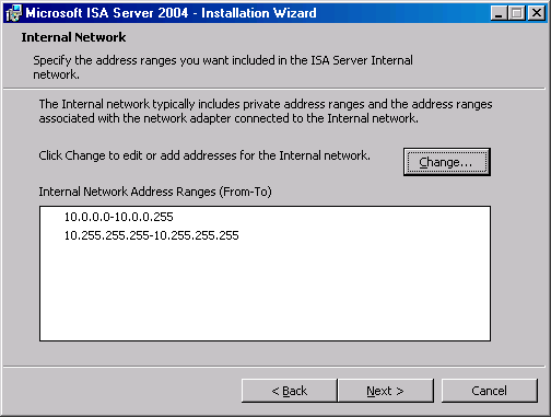 ISA 2004防火墙外部接口上有一个真实的IP地址和默认网关,这样配置很重要,因为这个外部IP地址是必须被访问到的,默认网关地址也是必须的以便ISA 2004防火墙能响应Internet主机的请求。DNS服务器地址应该是一台能解析Internet主机名的DNS服务器,因为托管的ISA 2004防火墙/Web/FTP/SMTP服务器需要解析外发邮件的Internet MX 域名,注意,配置中也可以使用ISA 2004防火墙自带的SMTP Message Screener。