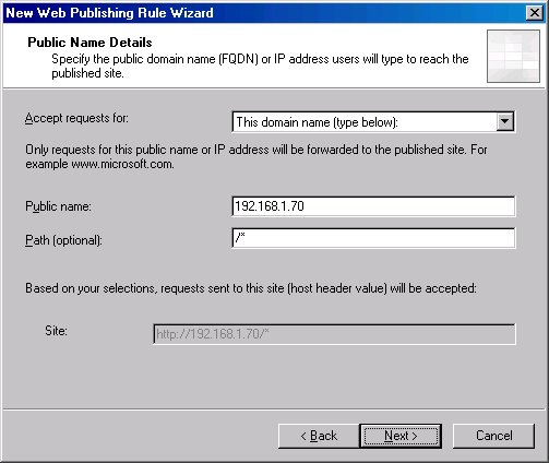 6.Public Name Details:选择“This domain name(type below)”,输入ISA 2004防火墙外部IP地址,注意:这里使用的IP地址仅作示范。我建议你不要发布公开的用IP地址就可以访问的WEB站点,在Path(optional)输入"/*"。