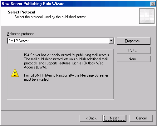 为了能让远程用户访问ISA 2004防火墙上的服务,我们必须使用Web/Server发布规则。Web发布规则用来发布Web协议(HTTP,HTTPS(SSL))。Web协议没有严格定义,你也可以使用Web发布规则发布download-only FTP站点,所有其他的服务必须使用Server发布规则,Web和Server发布规则体现了ISA 2004防火墙连接的复杂的应用层检测机制。