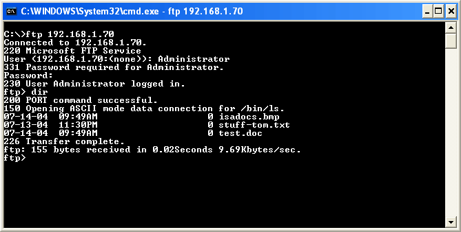 现在来测试FTP站点的功能,在ISA防火墙主机的FTPROOT目录中放入些文件,从外部客户机上打开命令行,输入ftp 192.168.1.70,输入administrator和管理员密码,输入dir,你会看到文件列表,使用GET命令来下载文件,PUT命令上传文件。