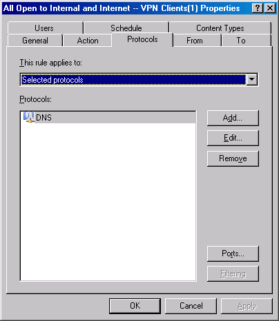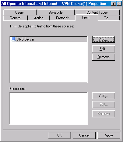 我们需要建立允许VPN客户访问Internet和内部网络的访问规则。不像ISA 2000防火墙只有Web代理客户和防火墙客户才能通过连接到的ISA防火墙来访问Internet,ISA Server 2004防火墙允许SNAT客户通过连接到的ISA防火墙来访问Internet。