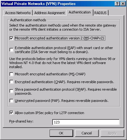 重启后,背端ISA防火墙/VPN服务器将接受PPTP和L2TP/IPSec连接;