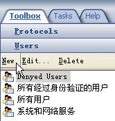 首先打开ISA Server 2004管理控制台,然后点击防火墙策略,然后点击右边的工具箱,点击用户,点击新建