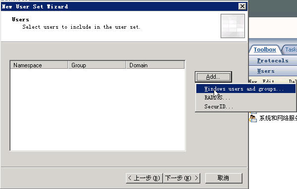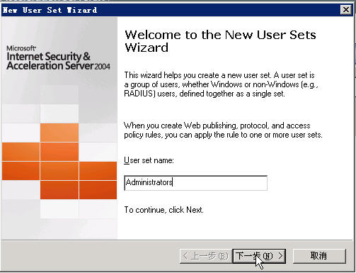 在欢迎新建用户集向导页,输入用户集名字,在此我命名为Administrators,点击下一步;