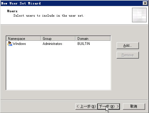 在用户页,删除默认的所有用户,点击添加,选择Administrators,点击下一步;