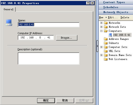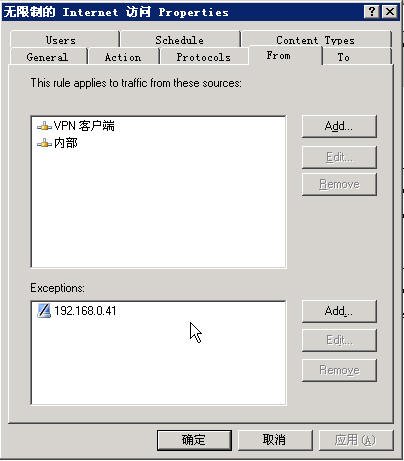 双击All Open策略,打开其属性,然后在从标签,在下面的排除中加入192.168.0.41,这样,92.168.0.41这个客户将不能通过这条All Open策略上网了。