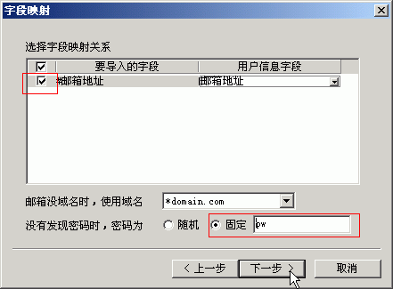 6.选择要导入的字段:邮箱地址。设置一个统一的初始密码,例如:pw。