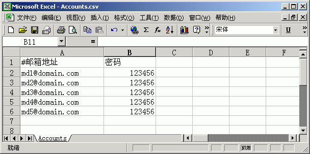 Winmail Server的导入支持.csv和.txt文件格式,其实就是逗号分隔的文本格式,可以参考Winmail Server账号导出的文件:
