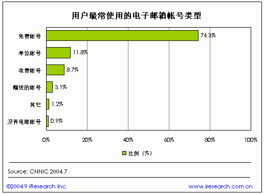 iResearch根据中国互联网络信息中心公布的“第十四次中国互联网络发展状况统计报告” 数据整理显示:中国有74.3%的网民最常使用的电子邮箱帐号为免费帐号。
