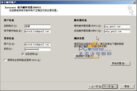 在这一窗口中,姓名和电子邮件地址不用多说,在服务器信息里,接收邮件服务器(POP3)一栏填入:pop.gmail.com;在发送邮件服务器(SMTP)一栏填入:smtp.gmail.com,登录信息的用户名需要将邮箱完整填入(如图所示),密码当然就是你用的那个密码了,如果是在自己的电脑上使用,可以使用“记住密码”,如果是多人使用一台电脑,还是考虑一下再点吧,接下来点击“其他设置”,进入下一步。