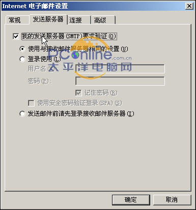 在这一步中,首先点击进入“发送服务器”面板,勾选“我的发送服务器(SMTP)要求验证”,下面的选项中,可以选择“使用与接收邮件服务器相同的设置”也可以选择“登录使用”,然后在下面填入用户名和密码,这要看个人爱好以及邮箱的需要了:)