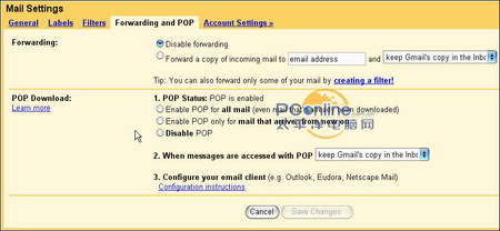 支持POP3功能Mail Settings中Forwarding and POP设置界面(点击小图放大观看)