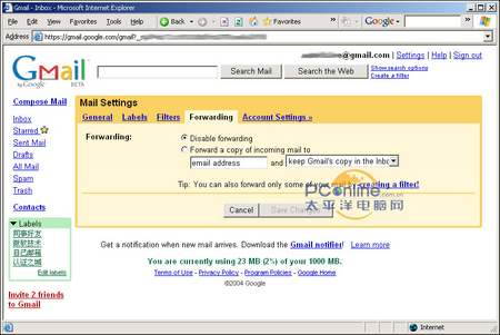 照例的打开来看,发现原来Gmail给我们带来了众多玩家梦寐以求的POP3支持!