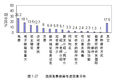 用户选择免费邮箱考虑因素主要是不缴费,其他选择比例较高的有邮箱容量,安全稳定和访问速度等。