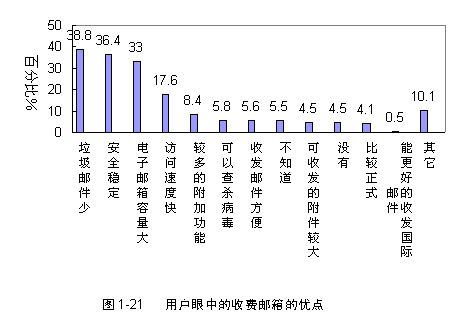 相对于免费邮箱,被访者认为收费邮箱主要优点表现为垃圾邮件少、安全稳定、电子邮箱容量大,它们比例均超过了30%,其他比较多的选项有访问速度快、附加功能多等。这些方面使得收费邮箱与免费邮箱相区别,也是其存在的原因和价值所在,因此收费邮箱只有在这些方面做的更好,在功能和服务质量上大大优于免费邮箱,才能在邮箱市场上占据更多的份额。