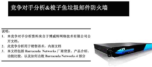 该公司销售负责人向记者出示了美讯智“竞争对手分析&梭子鱼垃圾邮件防火墙”资料,该资料被广泛地散发到美讯智代理商及最终客户手中,对博威特网络公司造成了很不好的影响。该销售负责人向笔者指出了该文档中种种的歪曲事实、恶意攻击之处。