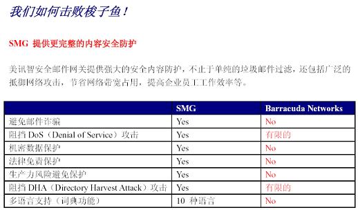 博威特网络公司销售负责人指出梭子鱼垃圾邮件防火墙产品有Anti-spoofing及Anti-phishing功能,能够非常完善地避免邮件诈骗,同时支持各种语言,包括简体中文、繁体中文、日语、荷兰语、法语、西班牙语等各语种,美讯智所列的不支持多语言支持是完全错误的。