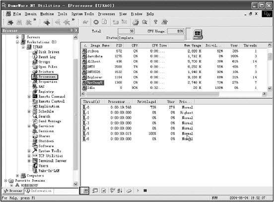 双击“Browser”框中的“Processers”项,在右侧窗口中弹出进程列表,列出远程客户机系统运行的所有进程,管理员可以对每个进程进行认真分析,如进程ID、CPU的耗费时间、内存占用量、线程数,来查找问题所在。此外,还可以查看某个进程的线程情况,能更深入地分析这个进程是否正常。如果发现异常的进程,结束也很简单,选中该进程,然后点击框体下方的“End selected Process”按钮即可。