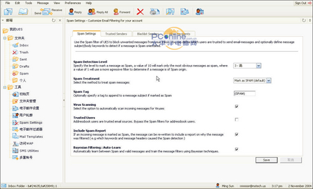 Spam Settings支持检测等级(1级为极端,最高,10级为最低,默认为3级,高),对垃圾邮件的处理方式、垃圾标记、病毒扫描、信任用户、垃圾邮件报告、贝叶斯规则,看起来非常不错。