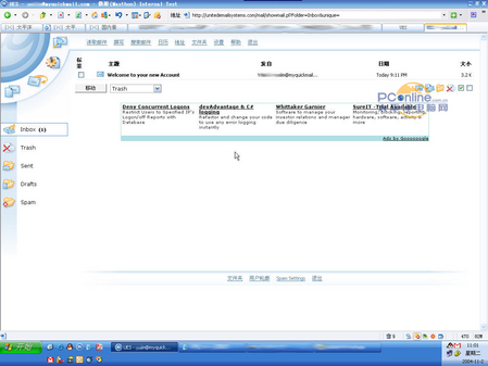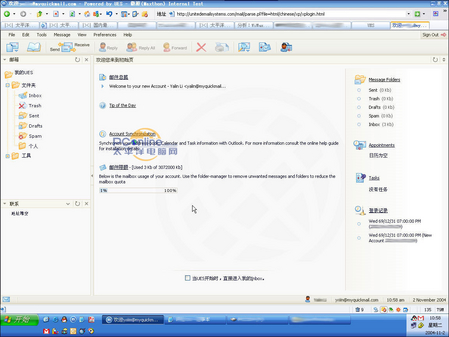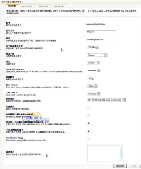 图中最下面Email Preferences(参数设置,那个浅蓝色的小图标部分)可以在Login Style那里选择登入后的界面,有两种选择:适用于低速连接的简单界面和用于高速连接的高级界面,当然,后者要求IE6以上浏览器才可以,最让伯狼惊喜的是它后面的那个参数:Preferred Language----首选语言,在下拉菜单里看到了Chinese!!,呵呵,这在GMAIL里是没有的。