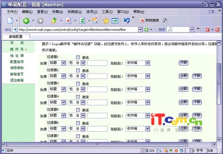 下面重点说一下邮箱的多重垃圾邮件过滤功能。现在垃圾邮件可以是说邮箱最大的天敌,所以大有对垃圾邮件是深恶痛绝,过滤垃圾邮件能力的强弱成了衡量邮箱功能的一个重要标准。Sogou推出的这款免费邮箱具有多重过滤垃圾邮件功能,点击“配置选项—超级过滤设置”,在这里我们可以根据“邮件头过滤”功能,来对邮件进行多重过滤,过滤器可以设为十个等级,且从一到十依次递减,相信通过这十个等级的设置,垃圾邮件将无处藏身了,同时还可以根据过滤设置功能,来对收到的邮件进行自动分类管理,邮件会根据设置自动的归到其相应的邮件组中。