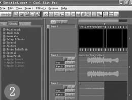 2. 回到主界面之后,我们会看到有三个通道已有内容,一个是胶卷状的(视频轨),两个是音波状的(音频轨)(如图2),双击噪音样本音轨(短音波状的那个),程序会打开波音编辑器,双击全选之。