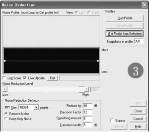 3. 打开左边的Effects列表,展开下面的Noise Reduction分栏并双击Noise Reduction,在弹出的对话框中点击Get Profile from Selection按钮,程序会读入噪音样本,之后关闭该对话框回到主界面,单击噪音样本音轨,按Delete删除它,再双击另外一个波音音轨,进入波音编辑器界面再双击,全选之后按照上面的操作再次打开Noise Reduction对话框,按OK按钮,程序便开始去除噪音。