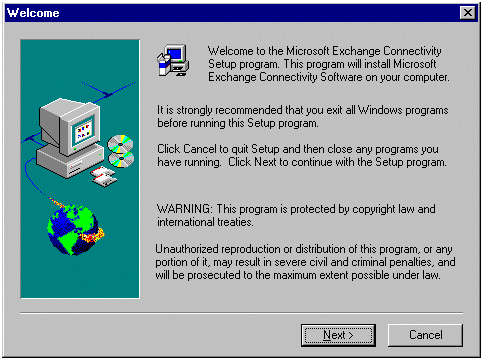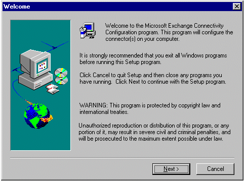 登录到 Exchange Server 桥头服务器并关闭所有已打开的应用程序。将 Exchange Server 5.5 CD-ROM 插入 CD-ROM 驱动器。单击开始,单击运行,并键入以下路径:CD ROM 驱动器号:\Server\Exchconn\Setup\Ent\Setup.exe。单击确定。将会启动 Microsoft Exchange Connectivity Setup 程序,并出现以下对话框。单击 Next。