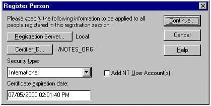 选择 Lotus Notes 服务器名称 (NOTES_SRVR1/NOTES_ORG),然后单击 People 按钮。在弹出式菜单上,单击 Register Person。