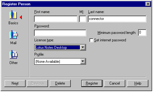 当出现以下对话框时,在 Last name 字段中键入“connector”。将 Minimum password length 设置为 0,并将 License type 设置为“Lotus Notes Desktop”。单击 Mail 图标以继续注册。