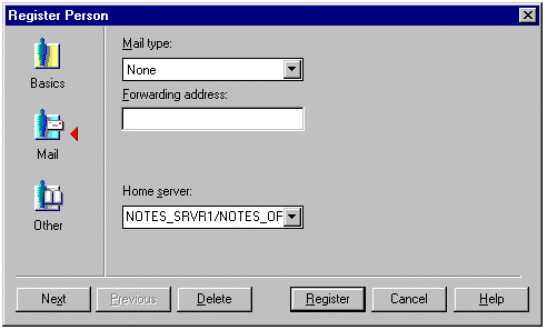 当出现以下对话框时,将 Mail type 设置为 None。将 Home server 设置为 Exchange Notes Connector 桥头服务器(本方案中为 NOTES_SRVR1/NOTES_ORG)。不要将该设置保留为 Local。单击 Other 以继续注册。