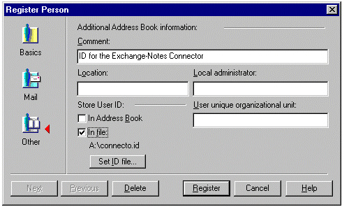 当出现以下对话框时,清除 In Address Book 复选框,并选中 In file 复选框。在驱动器 A 中插入一张软盘,单击 Set ID file,将该文件保存为 A:\Connecto.id。我们建议您在 Comment 字段中输入下面显示的注释。单击 Register 按钮以完成该操作。当询问是否再注册一个人时,单击 No。退出 Server Administrator。