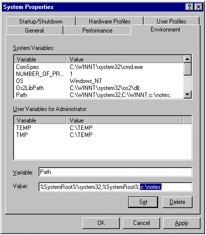 Exchange Server 桥头服务器(本方案中为 EXCHANGE_SRVR1)上必须安装了 Lotus Notes 客户,并配置为使用与 Exchange Notes Connector 相关联的 Notes ID 文件:本方案中为 Connecto.id。在安装 Lotus Notes 客户之后,确认 Lotus Notes 工作目录在 Windows NT 系统路径中。在“Windows NT 控制面板”中,双击“系统”,然后单击环境选项卡。从系统变量栏中选择 Path 语句。添加 Lotus Notes 客户的工作目录,一般为 %驱动器%\Notes,其中 %驱动器% 是装有 Notes 的硬盘驱动器号。用分号 (;) 将您设置的条目与该文本框中已有的路径隔开。单击设置,然后单击应用以注册更改。单击确定,退出系统属性。要使此更改生效,您需要重新启动计算机。