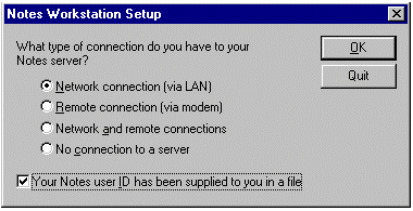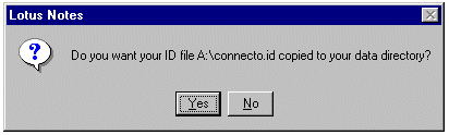 当第一次启动 Lotus Notes 客户时,就会出现以下对话框。单击 Your Notes user ID has been supplied to you in a file 复选框。将包含 Connecto.id 文件的磁盘插入驱动器 A,然后单击 OK。