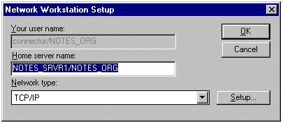 当出现以下对话框时,在 Home server name 字段中输入 Lotus Notes 桥头服务器 (NOTES_SRVR1/NOTES_ORG),然后单击 OK。