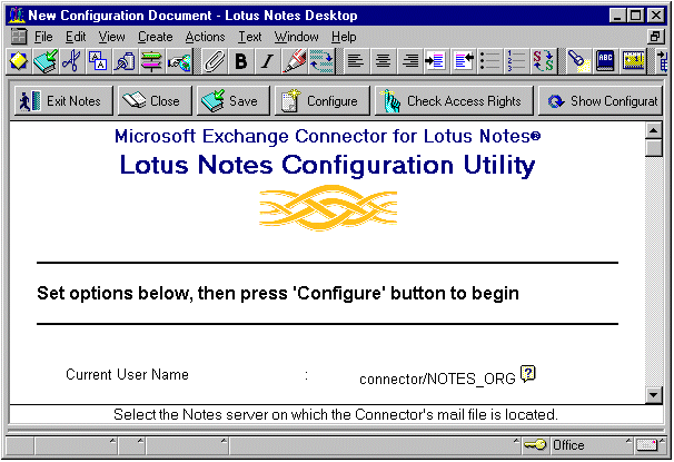 登录到 Exchange Server 桥头服务器 (EXCHANGE_SRVR1)。启动 Lotus Notes 客户。在 File 菜单上,单击 Tools,然后单击 Switch ID。将 ID 文件由 Connecto.id 切换为 Lotus Notes 桥头服务器上具有管理访问权限的一个 ID (NOTES_SRVR1/NOTES_ORG)。单击开始,单击程序,单击 Microsoft Exchange Connectivity,然后单击 Notes Configuration ,开始配置 Lotus Notes。Notes Configuration 实用工具在 Lotus Notes 客户上运行,并向 Lotus Notes 桌面添加如下图标: