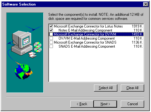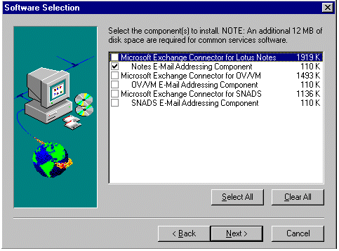 当出现以下对话框时,确保只选中 Microsoft Exchange Connector for Lotus Notes 和 Notes E-Mail Addressing Component 复选框,然后单击 Next。