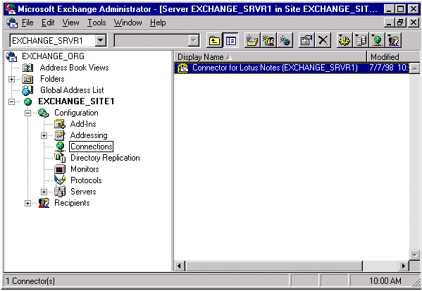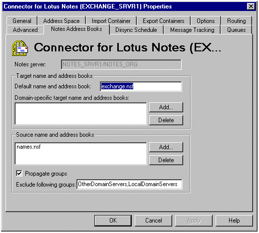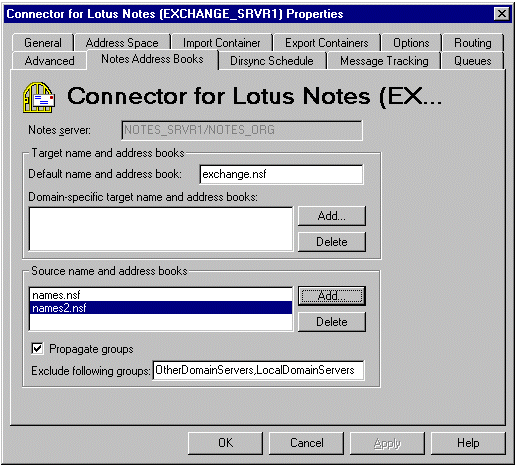 在 Exchange Server 桥头服务器(在本方案中为 EXCHANGE_SRVR1)上启动 Microsoft Exchange Server Administrator 程序。转至您站点的 Connections 容器。双击 Connector for Lotus Notes。当出现 Connector for Lotus Notes (EXCHANGE_SRVR1) Properties 页时,单击 Notes Address Books 选项卡。