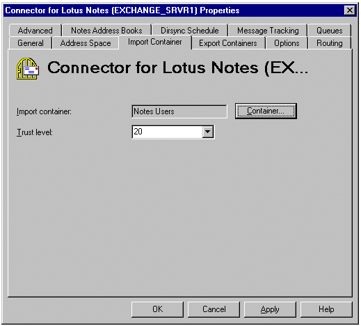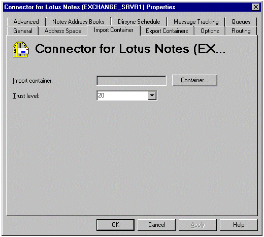 当出现 Connector for Lotus Notes (EXCHANGE_SRVR1) Properties 对话框时,单击 Import Container 选项卡,然后单击 Container 按钮。