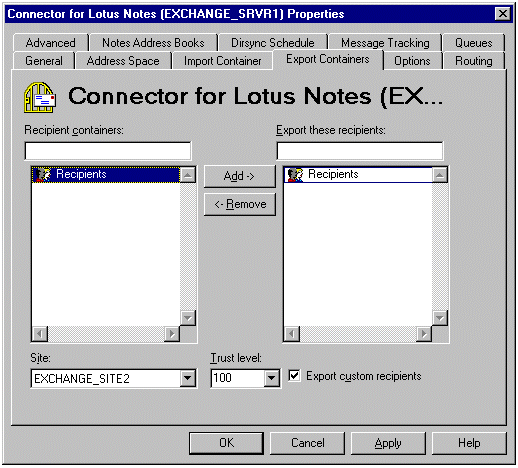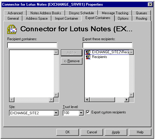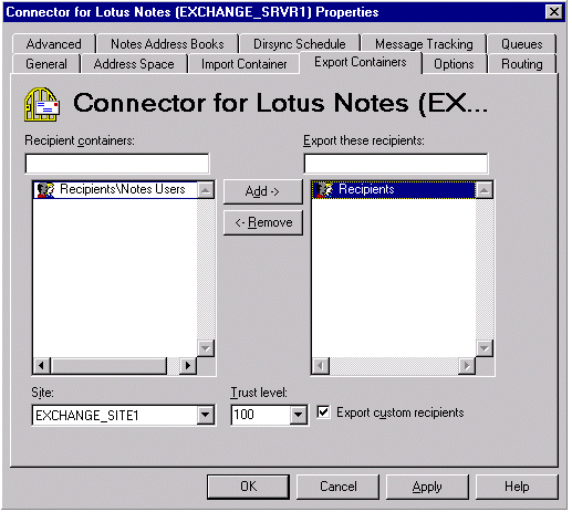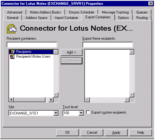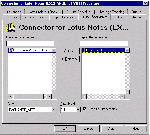现在,Recipients 容器中的所有 Exchange Server 用户都将被复制到 Lotus Notes 中。如果您要将其它邮件系统(如 SMTP)的 Exchange Server 自定义收件人输出到 Lotus Notes 中,则选中 Export custom recipients 复选框。如果您有多个 Recipients 容器,则添加您要传到 Lotus Notes 环境的所有容器。