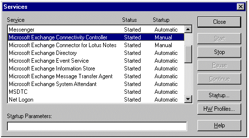 从“Windows NT 控制面板”中的“服务”工具上,启动 Microsoft Exchange Connectivity Controller 和 Microsoft Exchange Connector for Lotus Notes 服务。