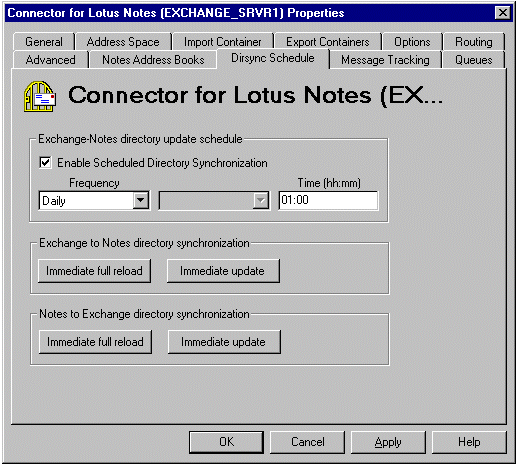 启动 Exchange Server Administrator 程序并单击您站点的 Connections 容器。双击 Connector for Lotus Notes,然后单击 Dirsync Schedule 选项卡。在 Exchange to Notes directory synchronization 下,单击 Immediate full reload。在 Notes to Exchange directory synchronization 下,单击 Immediate full reload。单击 OK,关闭 Connector for Lotus Notes Properties 页。