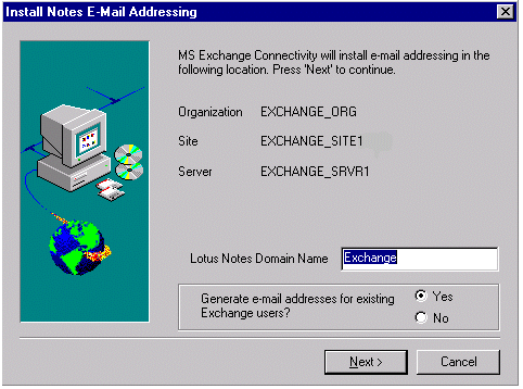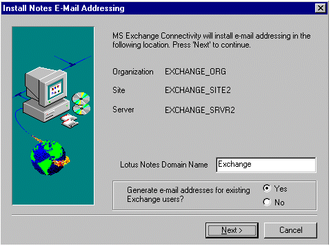 当出现以下对话框时,输入 Lotus Notes 外部域,标识 Lotus Notes 桥头服务器上您的 Exchange Server 组织。在本例中,Lotus Notes 外部域被定义为 Exchange。单击 Next。