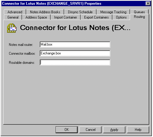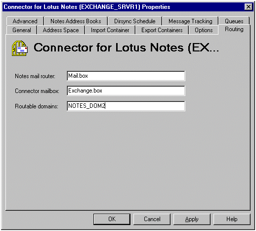 使用路由属性来配置 Exchange Server 环境,将其配置为将邮件路由到 Lotus Notes 域(但不是 Lotus Notes 桥头服务器域)。在 Exchange Server 桥头计算机上,启动 Microsoft Exchange Server Administrator,然后单击您站点的 Connections 容器。双击 Connector for Lotus Notes。当出现 Connector for Lotus Notes (EXCHANGE_SRVR1) Properties 页时,单击 Routing 选项卡。