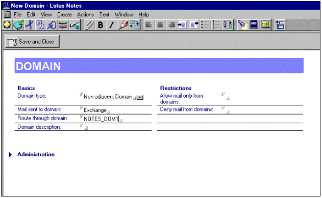 现在必须对下游 Lotus Notes 域进行配置,路由发往 Exchange Server 的邮件,使之通过 Lotus Notes 桥头服务器。通过在下游 Lotus Notes 服务器(本方案中为 NOTES_SRVR2/NOTES_ORG)上定义一个 non-adjacent domain,可实现此操作,如以下步骤所述:
