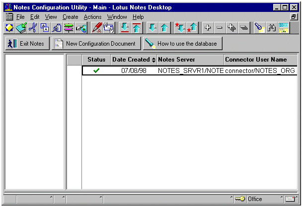 您必须重新配置 Exchange Server 桥头服务器上的 Exchange Notes Connector。在 Exchange Server 桥头服务器上启动 Lotus Notes 客户。切换到具有 Lotus Notes 桥头服务器管理访问权限的用户 ID。在 File 菜单上,单击 Tools,然后单击 Switch ID。将 ID 文件由 Connecto.id 切换为具有 Lotus Notes 桥头服务器 (NOTES_SRVR1/NOTES_ORG) 管理访问权限的 ID。从 Microsoft Exchange Connectivity 菜单运行 Notes Configuration Utility,在 Lotus Notes 客户上启动 Lotus Notes Configuration 实用工具。当出现以下对话框时,双击数据库中出现的那个条目。