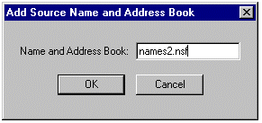 单击 Source name and address books 下的 Add 按钮。当出现以下对话框时,在 Name and Address Book 框中键入“names2.nsf”,然后单击 OK。